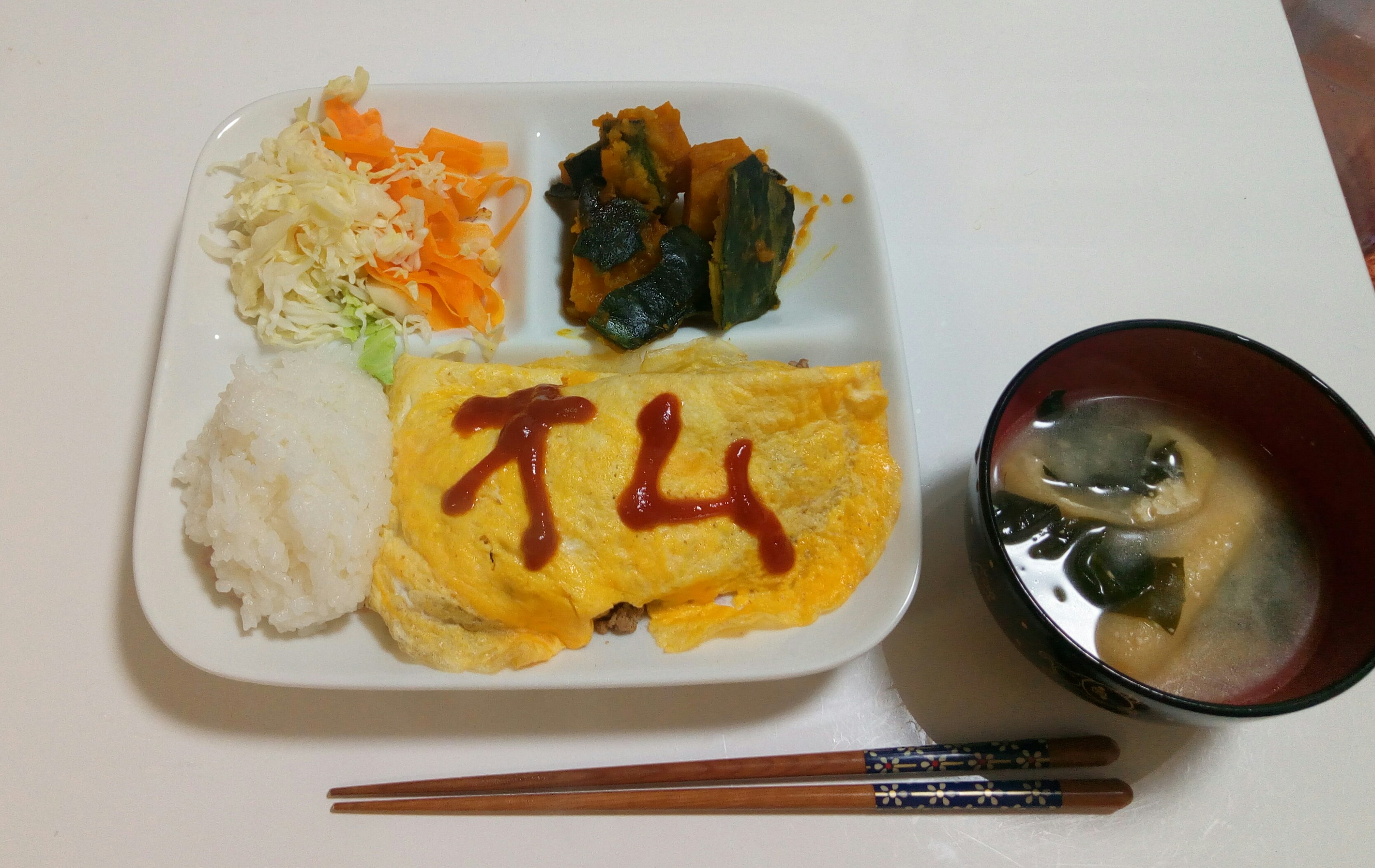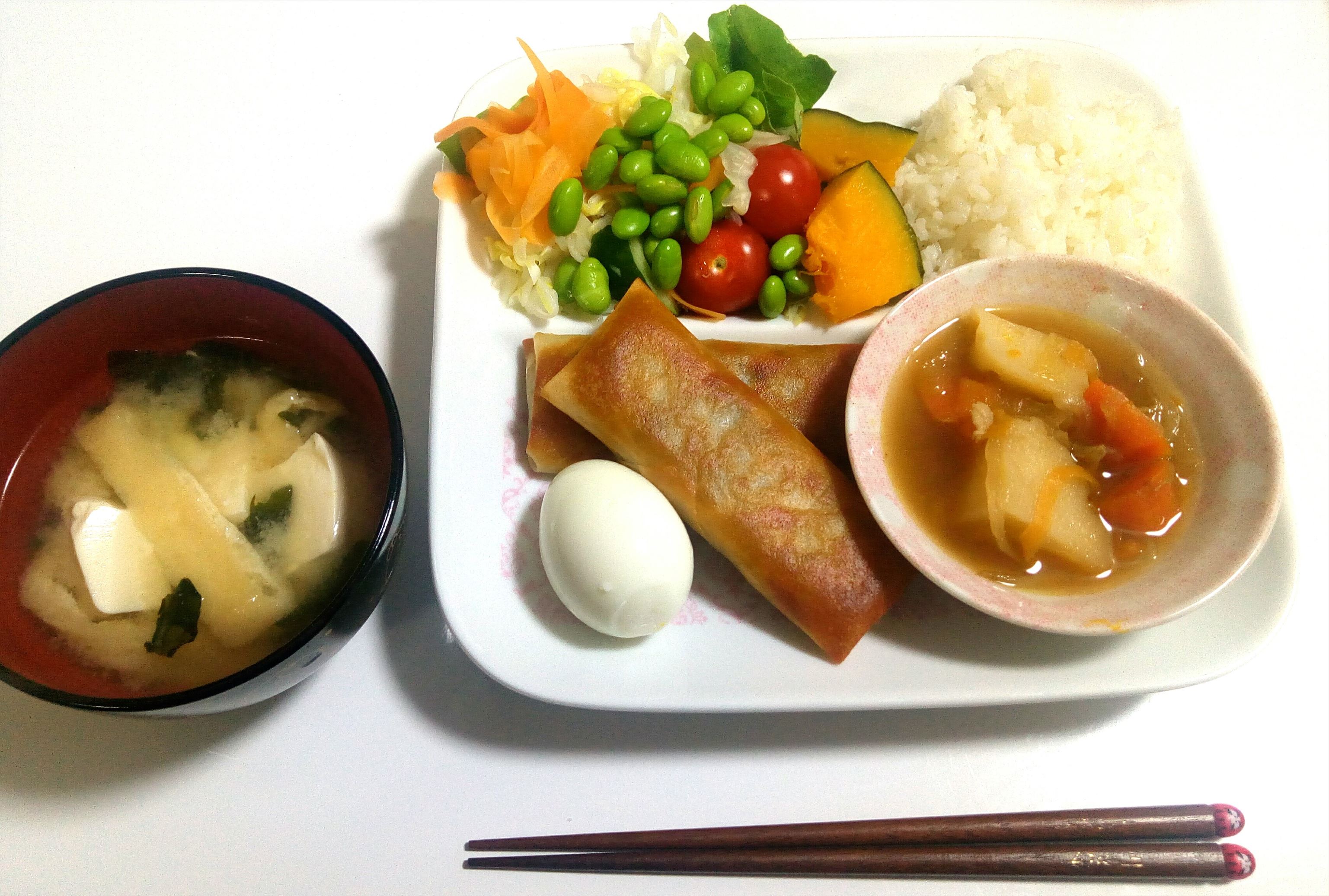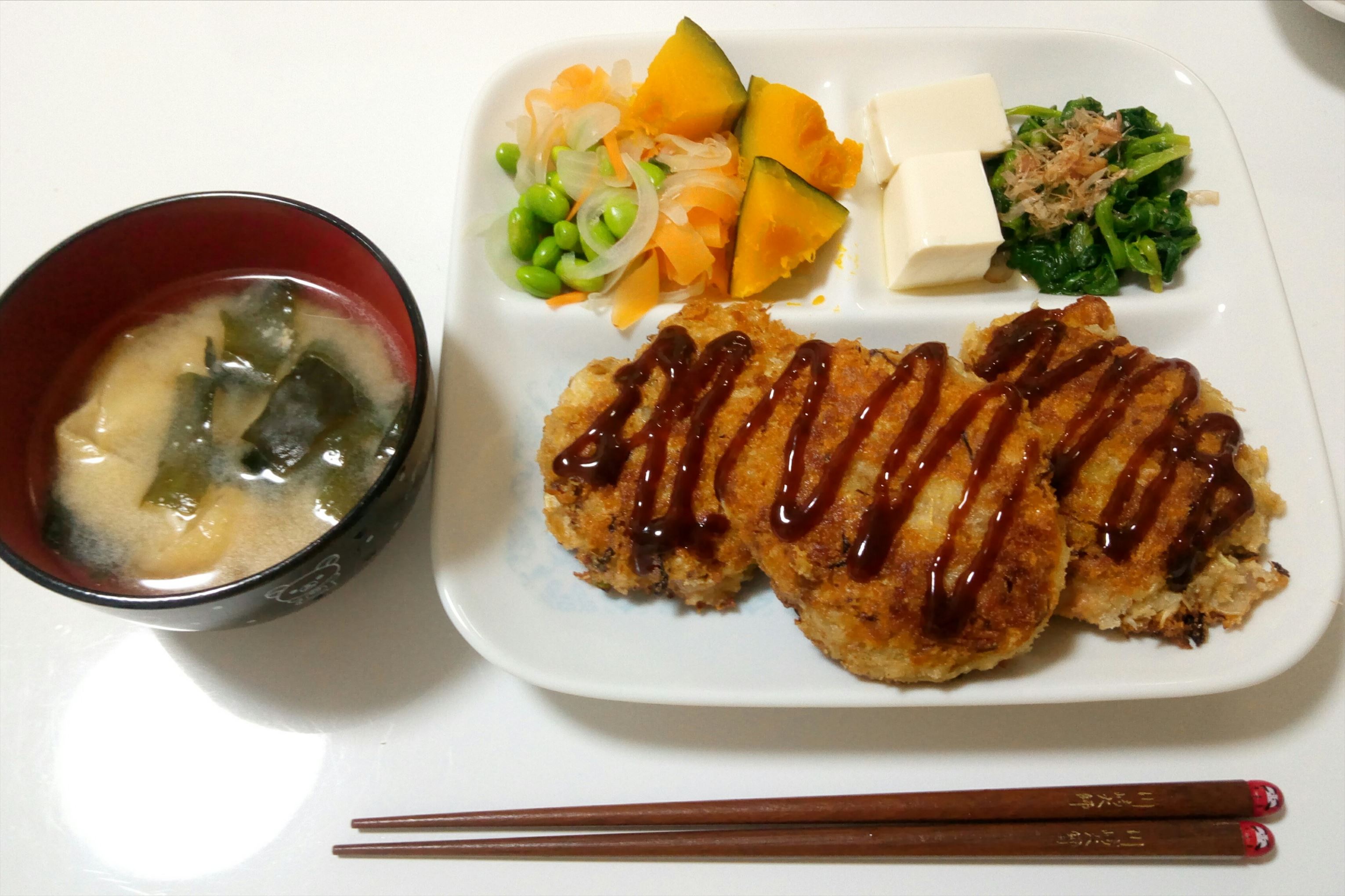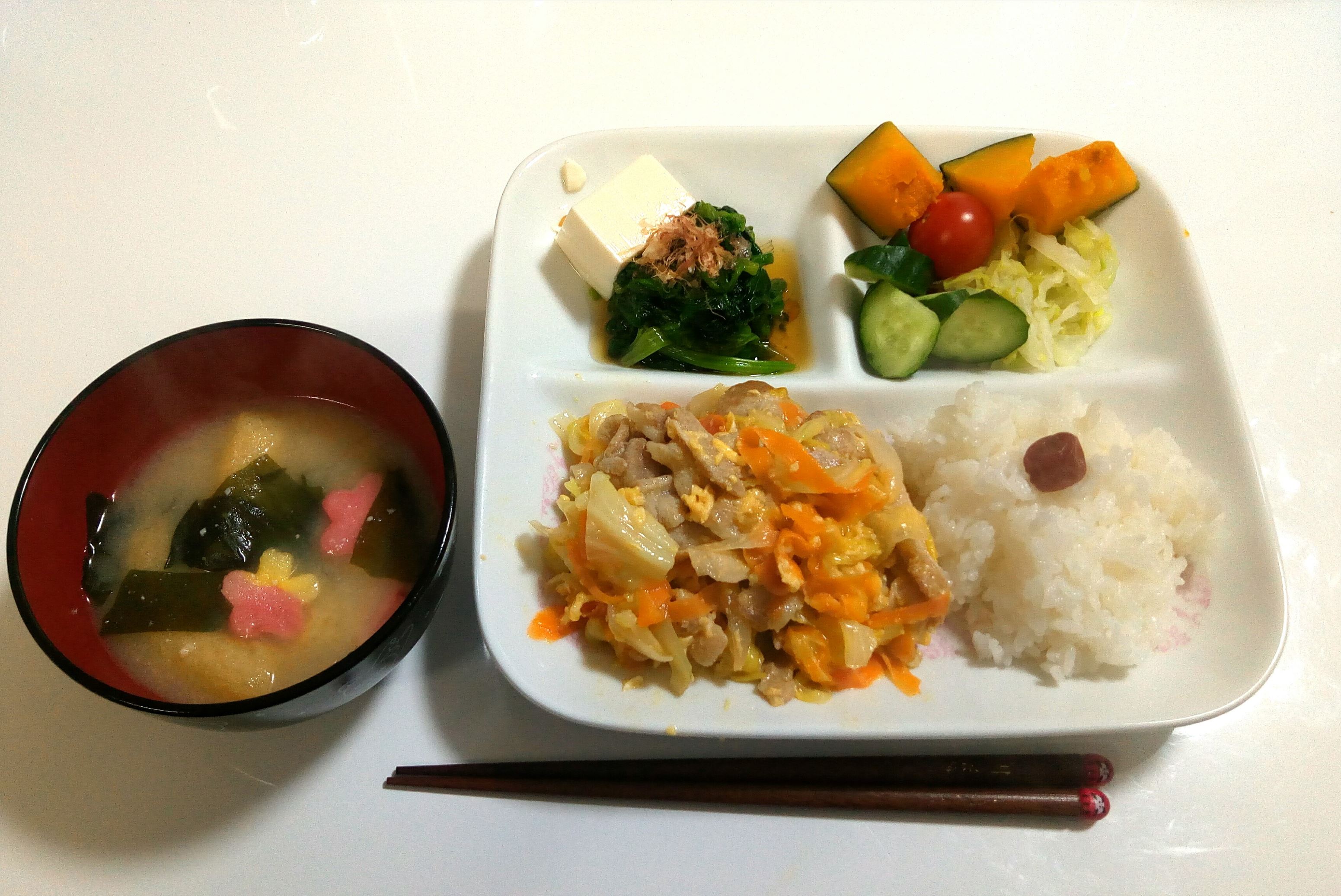 おひたし、かぼちゃ、サラダ、ひじき豆をつけてみました。