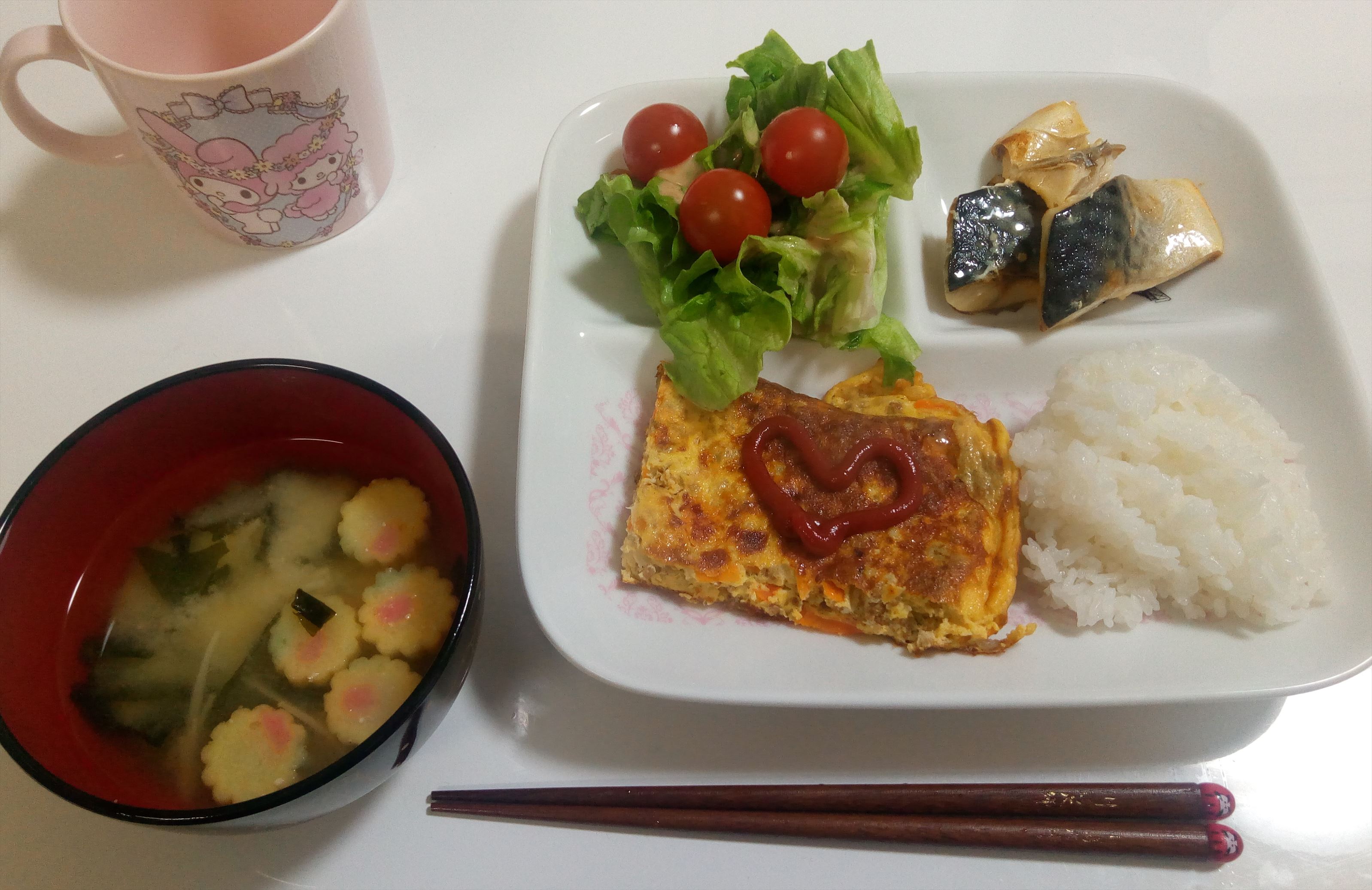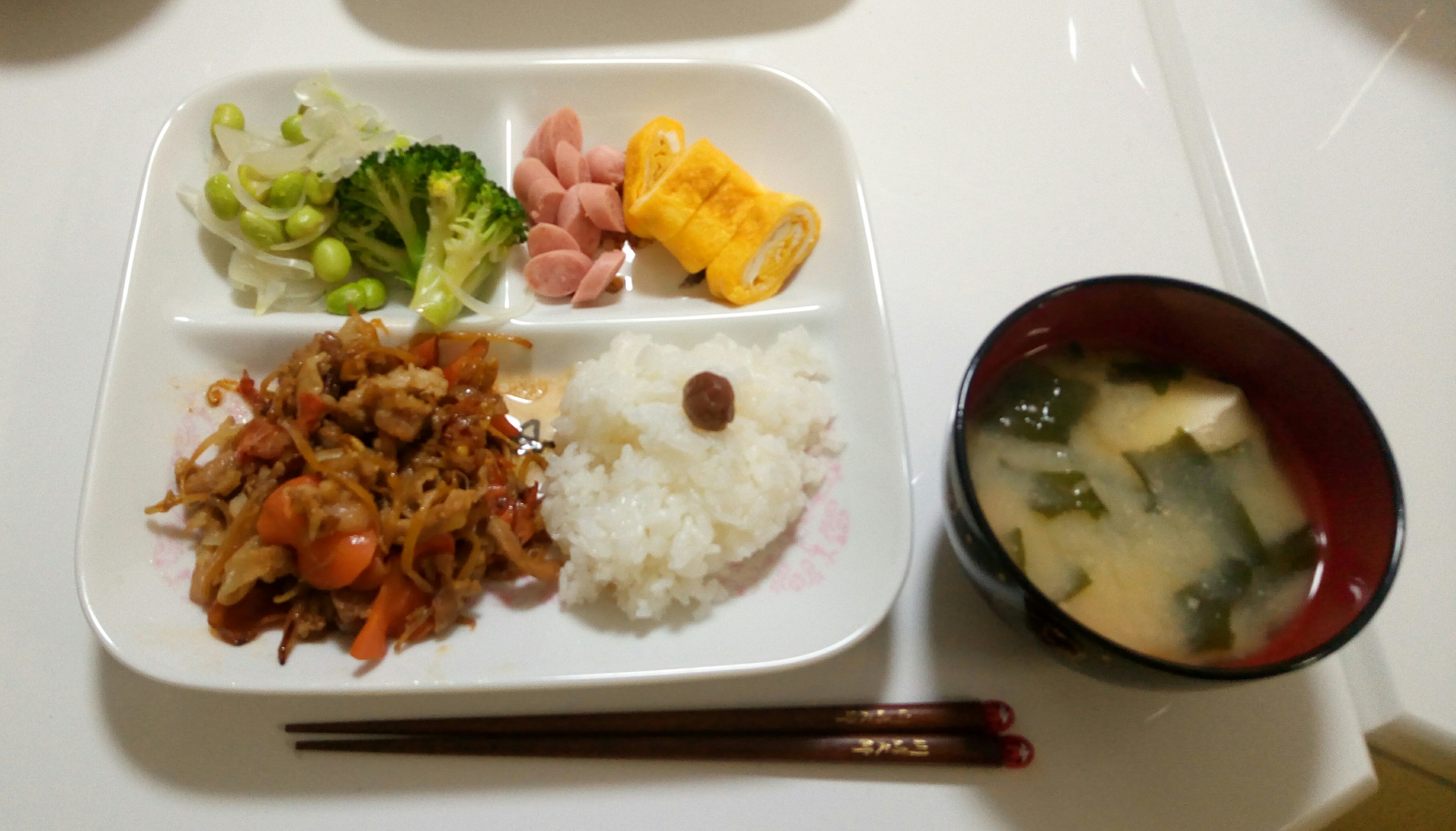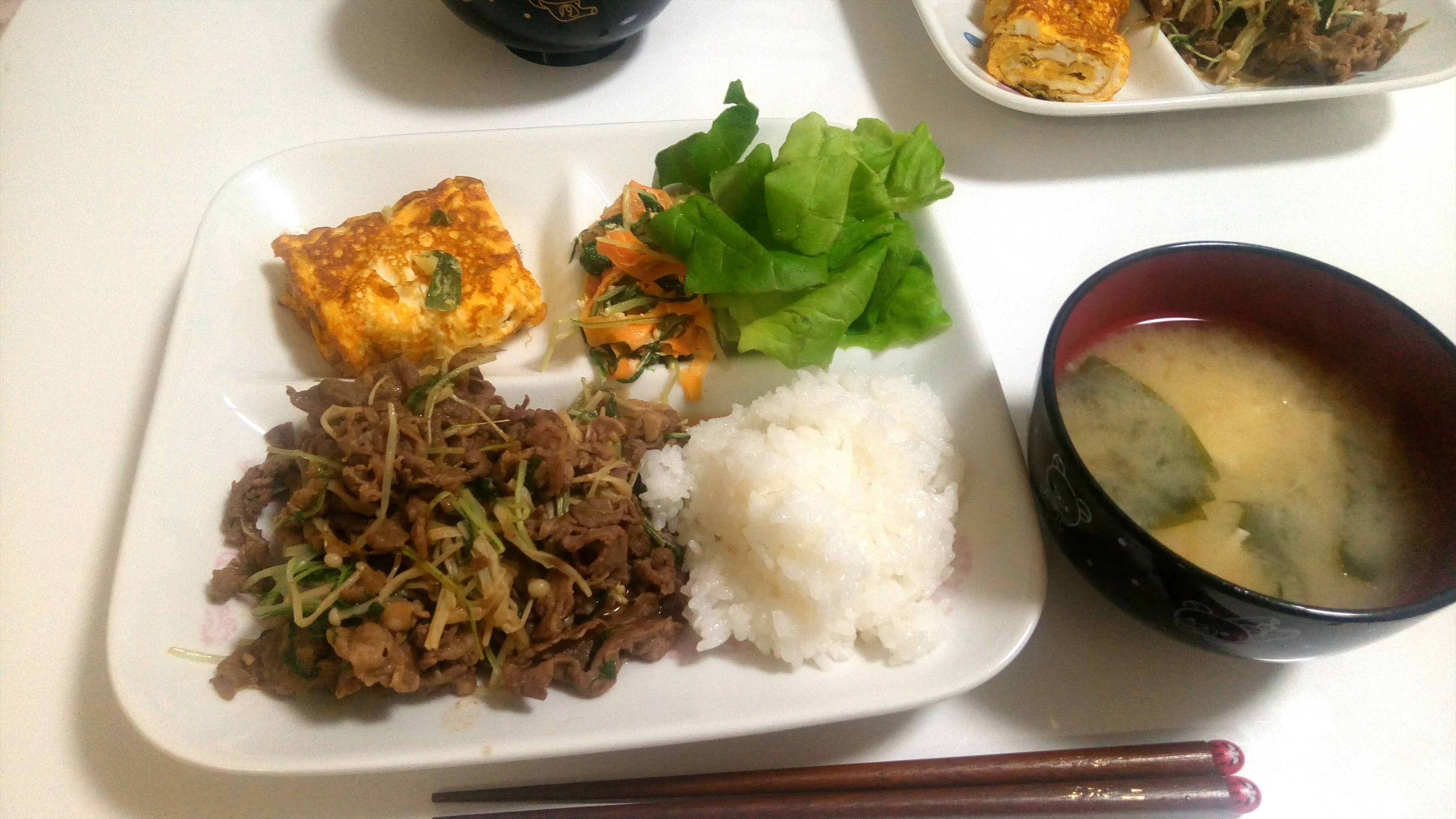 副菜に残っていた牛肉ミンチサラダを入れてしまいました…。たまにはOK!