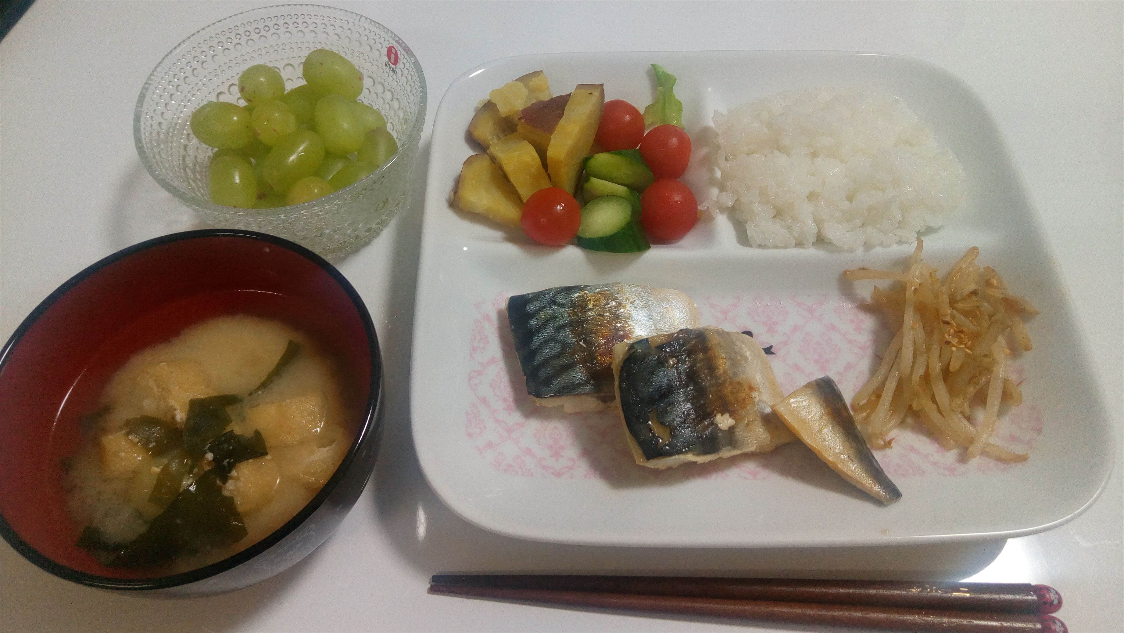 さば塩焼き。簡単、うまい!!!デザートもつけました。